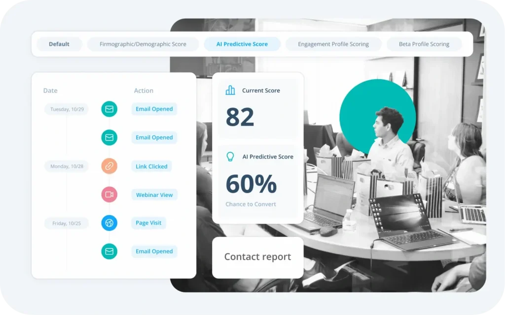 - Native CRM & lead scoring: A built-in way to manage contact data and automatically score leads based on how likely they are to convert.