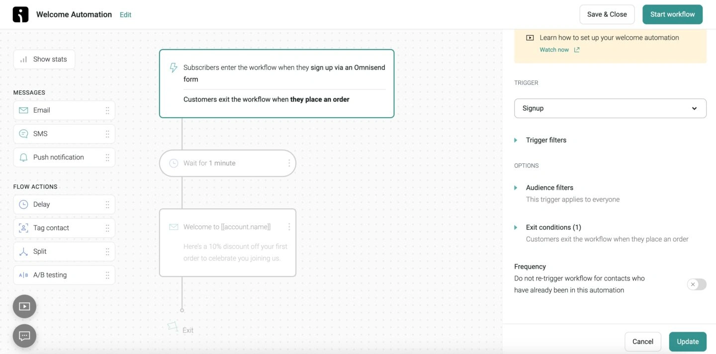 - Visual workflow builders: A drag-and-drop interface that lets you map out the entire customer journey visually.