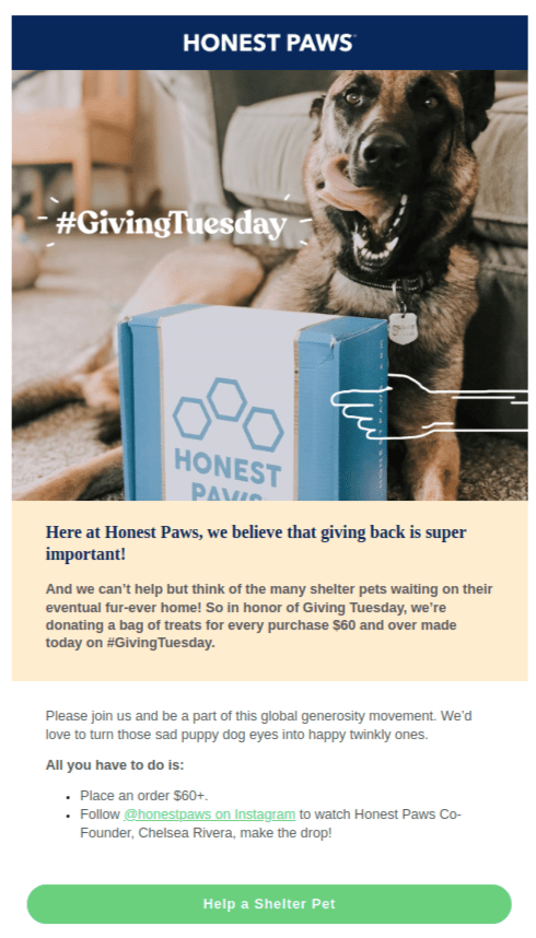 This Giving Tuesday email campaign by Honest Paws makes donating easy. Subscribers just have to buy their favorite products, and a donation is automatically made — it’s a win-win!