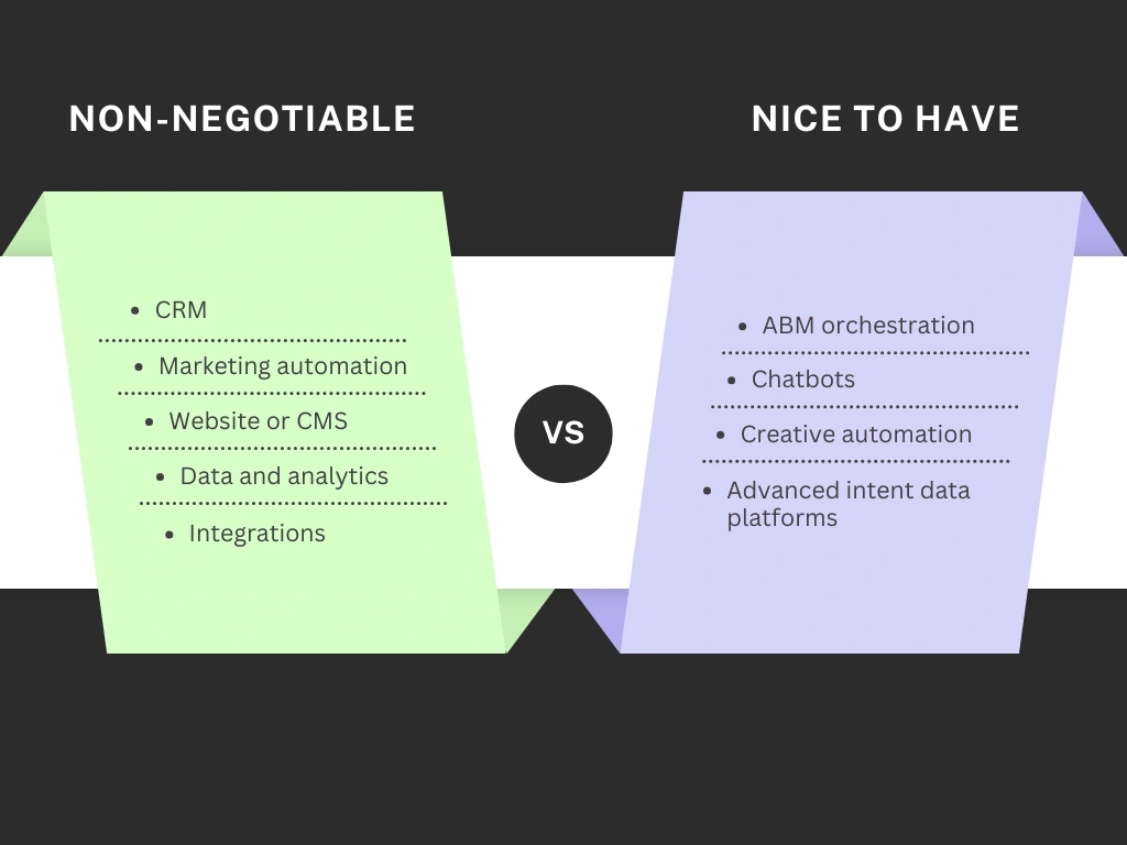 Every business should start with the foundations: CRM, CMS, marketing automation, and analytics. Once the core infrastructure is established, you can add value with ‘nice-to-have’ tools like chatbots, ABM orchestrators, etc.