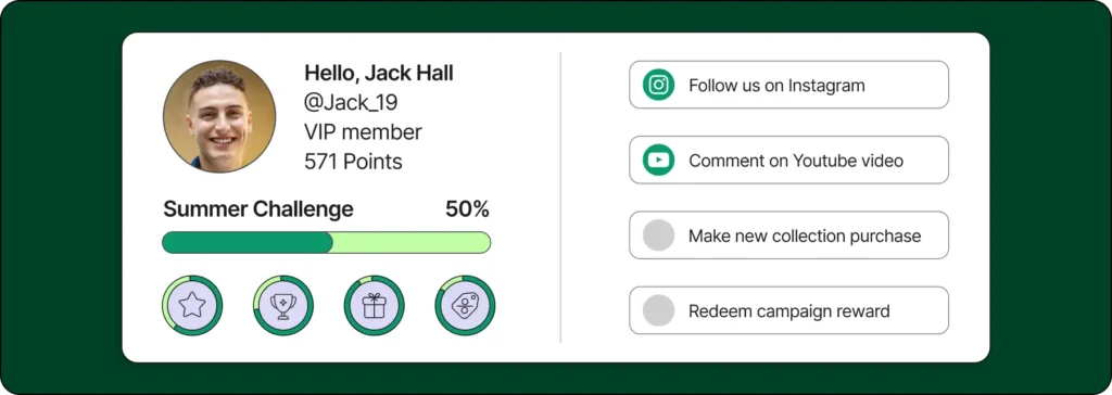 - Social media challenges: Customers earn points for posting an Instagram story, TikTok reel, YouTube video, etc., tagging your brand with dedicated hashtags.