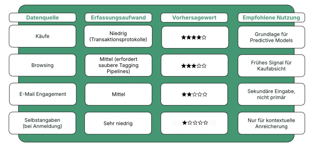 - Käufe sind das stärkste Signal: Sie zeigen Absicht, die bereits in Handlung umgesetzt wurde.