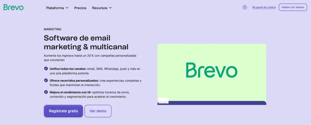 Esta plataforma destaca por sus servicios multicanal, con automatización del marketing en correos electrónicos, páginas de destino, notificaciones push y mensajes SMS. Permite configurar audiencias personalizadas en Facebook e Instagram.