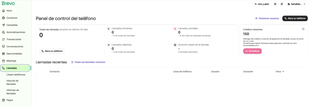 - Historial de llamadas y grabaciones (Brevo Phone)