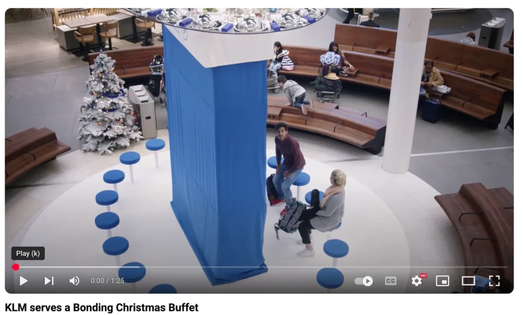 En 2016, la compañía aérea neerlandesa KLM ofreció una cena de Navidad anónima en un aeropuerto. La cena se encontraba en una mesa elevada con 20 sillas, en las que se podía sentar cualquier persona. Una vez que todos los asientos estaban completos, la mesa bajaba y los 20 desconocidos podían cenar juntos.