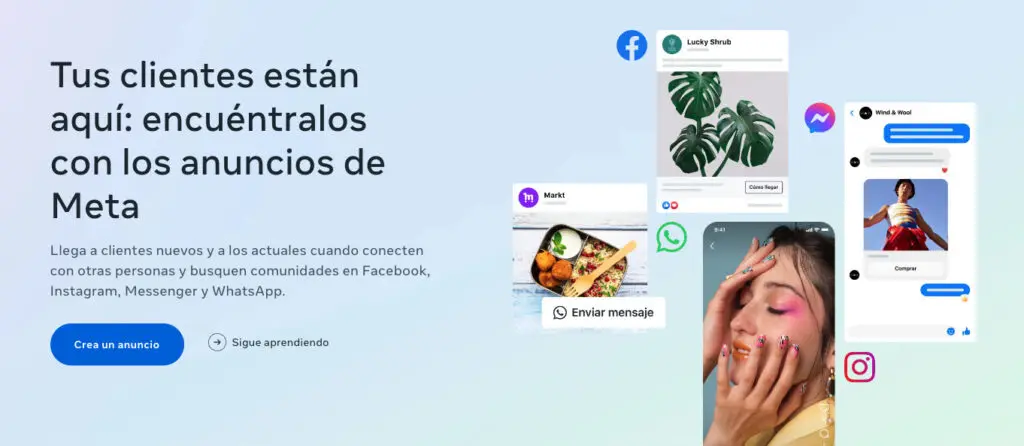 - Chat con clientes: anuncios de clic a Messenger y WhatsApp.