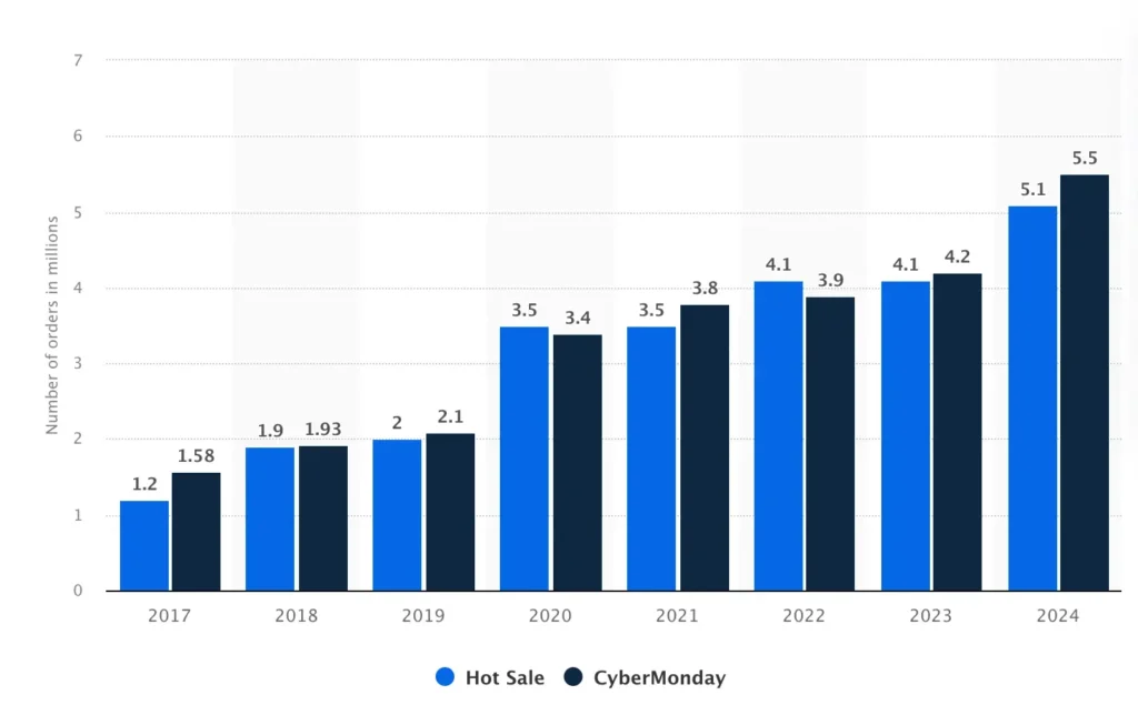 Número de pedidos (millones) en Hot Sale y Cyber Monday en Argentina (2017-2024) Fuente: Statista