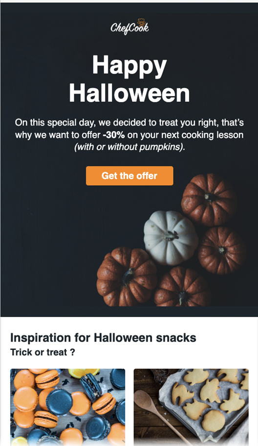 Por supuesto, indicar de forma destacada la festividad, ya sea Halloween, Black Friday, cyber monday etc. con el período de validez de los descuentos o incluso incluyendo una cuenta atrás, se consigue ejercer una sensación de presión positiva sobre el lector de manera que actúe de forma impulsiva. Eso se traducirá en una compra compulsiva, que es en definitiva el objetivo.