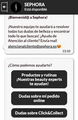 Te da la bienvenida y te pregunta qué deseas, del mismo modo que te atendería una persona al entrar en una tienda física. Al otro lado del chat, puedes hablar con alguien del equipo o un bot si contactas fuera del horario comercial. Pero la clave siempre es la atención inmediata.