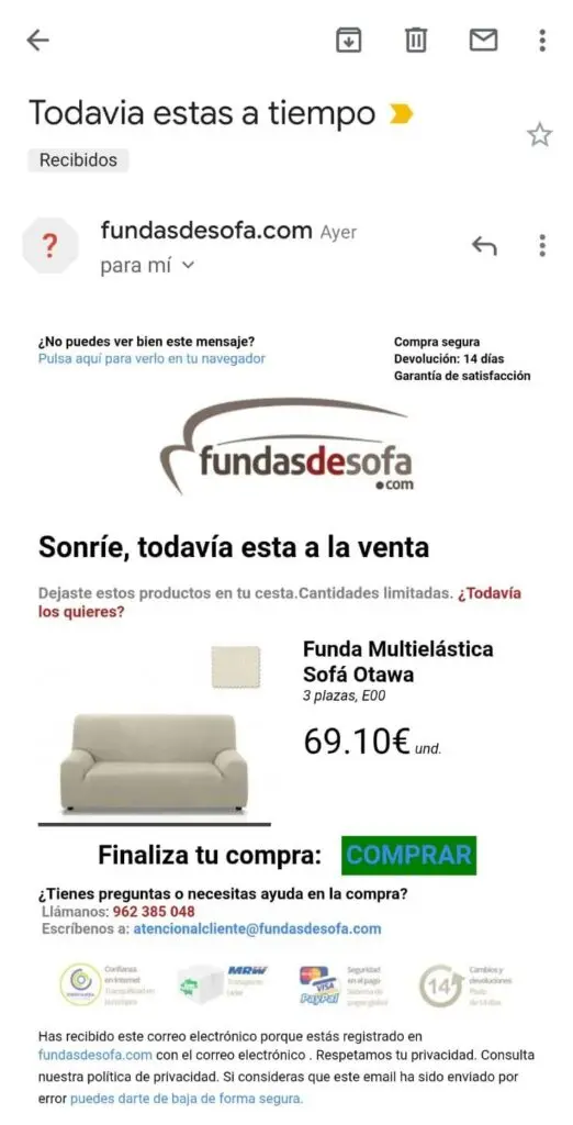 De esta forma, fundasdesofa.com consigue cerrar más pedidos recordando a sus clientes que tienen un artículo pendiente de compra. Si los clientes abandonan el proceso de compra por cualquier motivo, un email como este es el recordatorio perfecto.