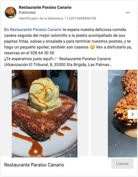 El Restaurante Paraíso Canario muestra sus mejores platos en un anuncio que puede ir dirigido a residentes de Canarias o a una audiencia similar basada en la clientela del restaurante. El usuario hace clic en el botón de llamada y se pone en contacto directamente con el local para reservar mesa.