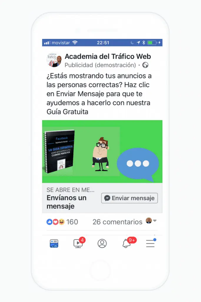 Academia del Tráfico Web publica un anuncio de Facebook ofreciendo una descarga gratuita. La audiencia hace clic en el botón y se abre el Facebook Messenger con un mensaje automatizado que permite a la academia llevar suscriptores a su base de datos.