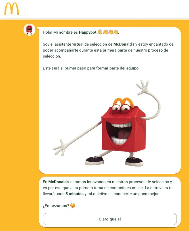 McDonald’s automatiza sus procesos de selección de candidatos con el Happybot. Esto le permite manejar un gran volumen de solicitudes de manera constante y eficiente para reducir la carga de Recursos Humanos y filtrar a los candidatos.