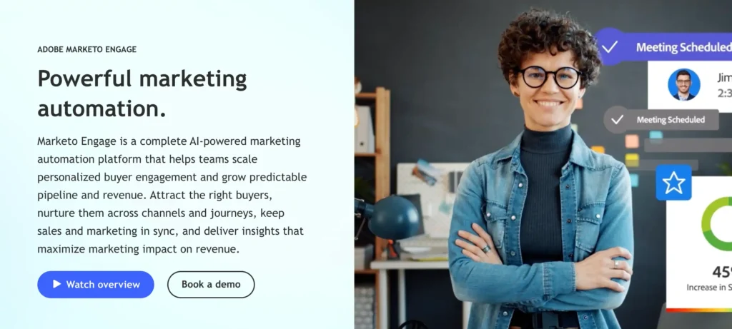 - Esto incluye orquestación visual de recorridos de cliente con IA y potentes funciones para email, así como herramientas de marketing basadas en cuentas (ABM) y adaptadas a dispositivos móviles.