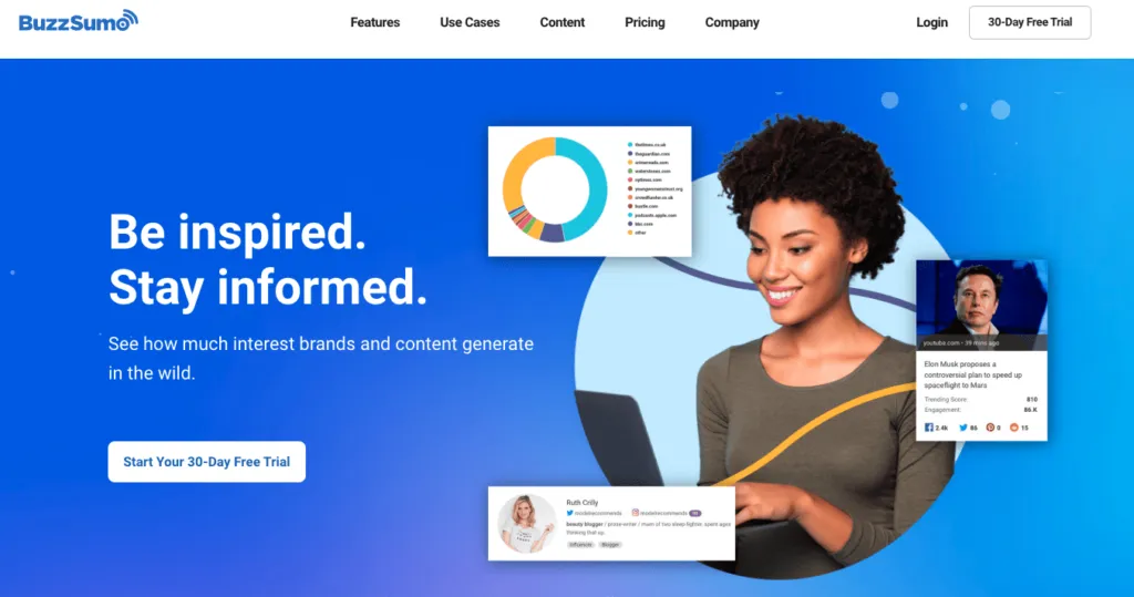 Tipo de herramienta: Buzzsumo es una herramienta de investigación de mercado. Ideal para entender tu competencia y los temas que busca tu audiencia. Esto es esencial para planificar tu contenido y ajustar tu estrategia de marketing.