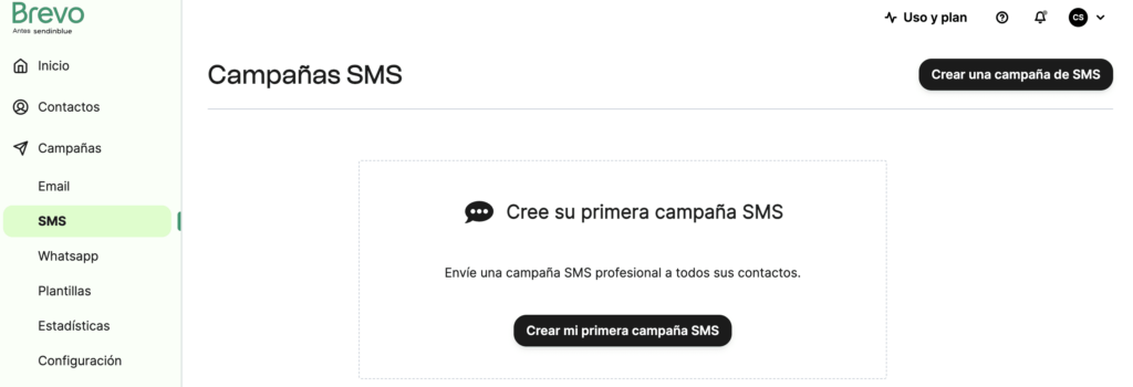 A la hora de enviar mensajes masivos, tienes muchas opciones y plataformas para ello. En Brevo cuentas con esta opción, tal y como puedes ver en la siguiente imagen.
