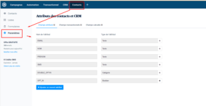 Sur Brevo, la manœuvre est simple : dans un premier temps, rendez-vous dans la catégorie "Contact">"Paramètres", onglet "Attributs des contacts et CRM", pour créer un nouvel attribut.