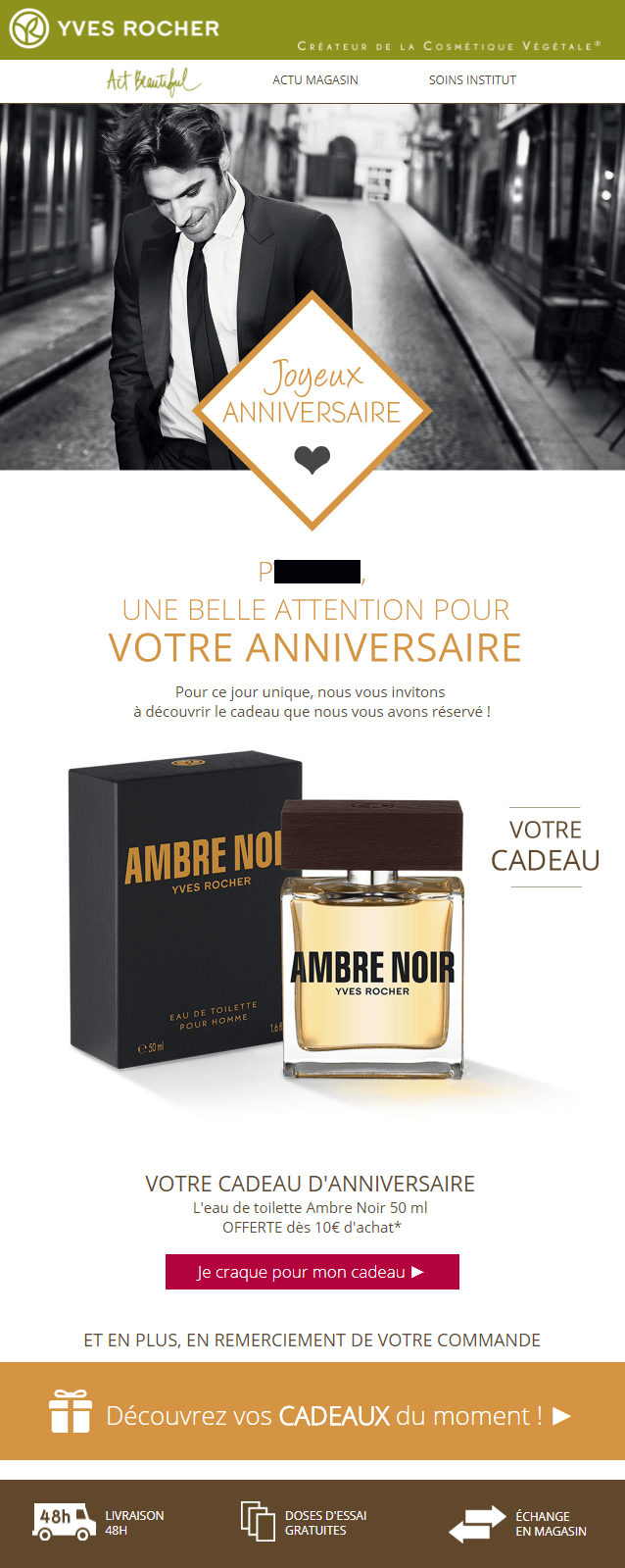 Yves Rocher utilise le prénom pour personnaliser l'email et propose un parfum pour homme en cadeau puisque l'inscrit est masculin.