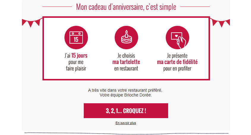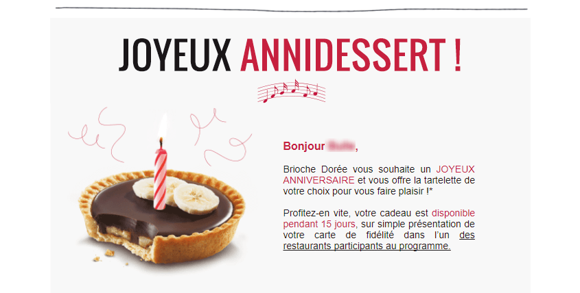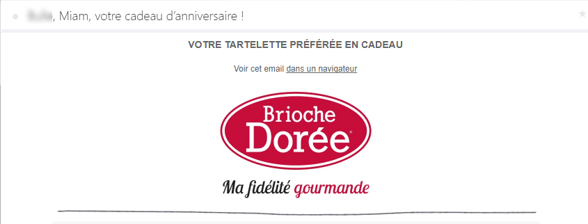 L'email d'anniversaire de la Brioche Dorée offre aux contacts un cadeau récupérable immédiatement : une tartelette d'anniversaire.