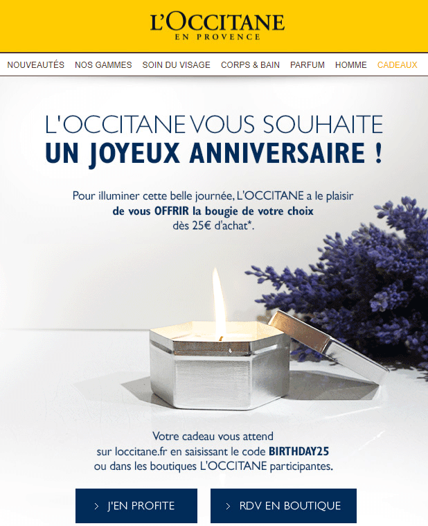 A l'inverse, l'email d'anniversaire de l'Occitane en Provence pose problème : le cadeau dépend d'un certain montant d'achat dépensé dans un temps imparti. Il a très peu de chance d'être récupéré.