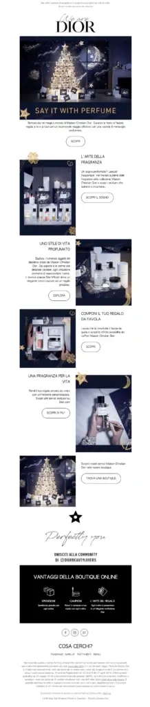 Christian Dior nella sua newsletter oltre a proporre un regalo personalizzato, rassicura i suoi clienti proponendo un campione gratuito del profumo scelto, in modo da poterlo provare prima di regalarlo.