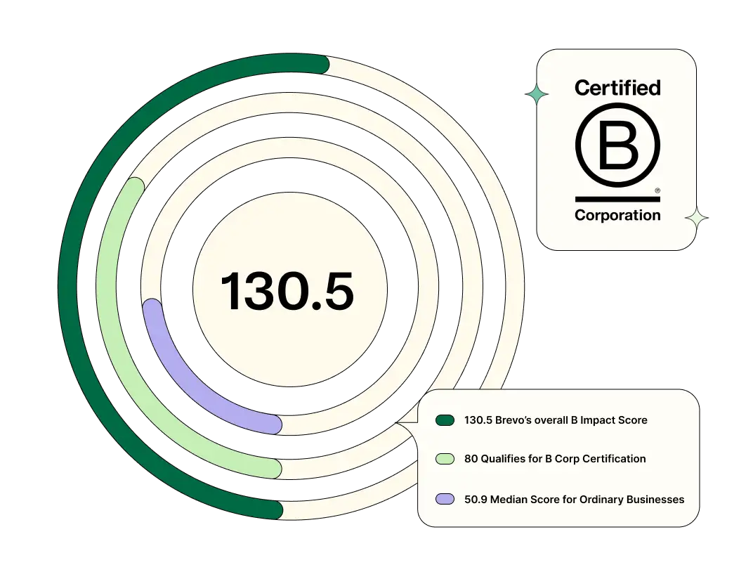 B Corp認証は、労働者、顧客、サプライヤー、コミュニティ、環境への影響などの要因に基づいて企業を評価する認証制度です。B Corpになることは、Brevoがビジネスを善の力として活用することにコミットしていることを意味します。