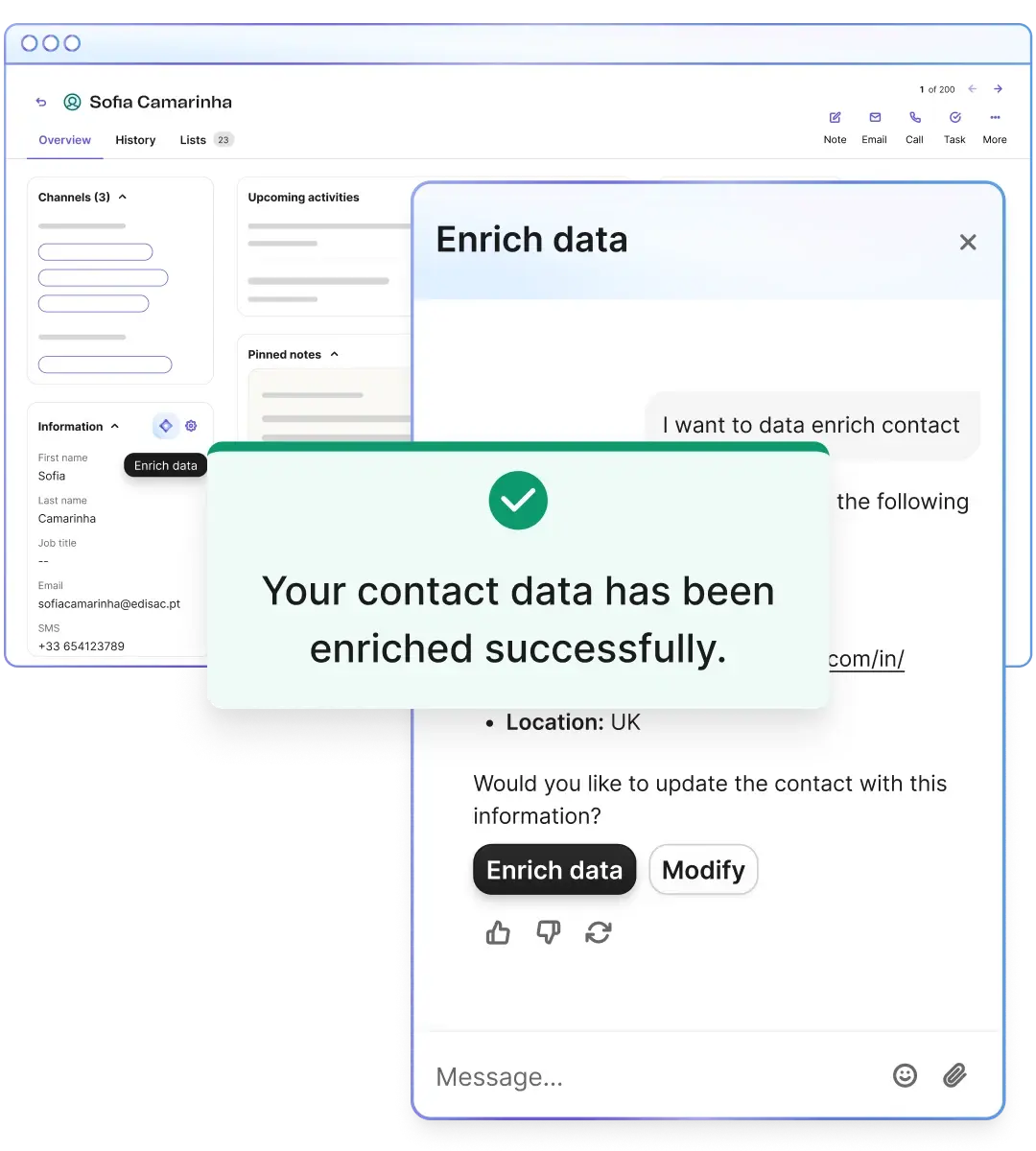商談作成の自動化、連絡先情報の強化、すぐに送れる営業メールの生成を支援します。