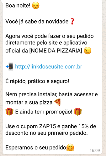 Claro, você pode customizar sua mensagem de acordo com a identidade da sua marca. Possui uma pizzaria, uma esmaltaria ou uma loja de roupas? Você pode brincar com isso nas suas mensagens: