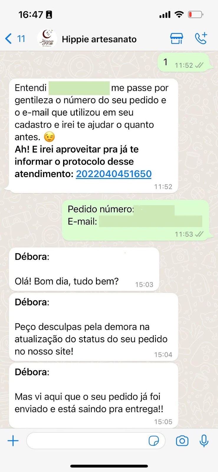 É realmente uma mensagem automática que dá conta do recado e economiza o tempo do atendente. Quando a Débora entrou na conversa, ela já veio com a resposta que o cliente precisava: saber o status de andamento da compra. Uma triagem super profissional!